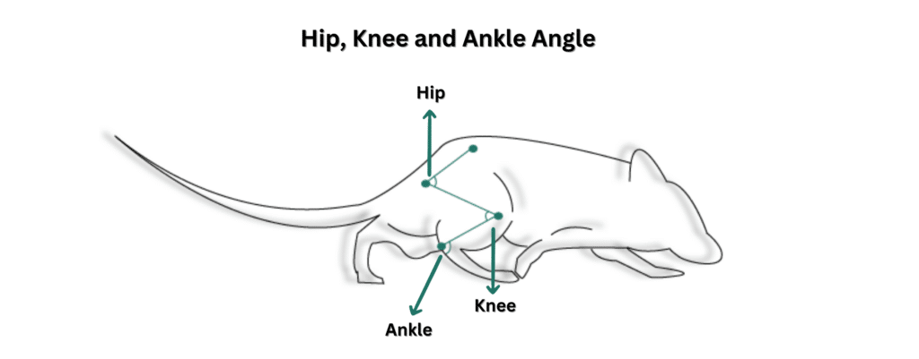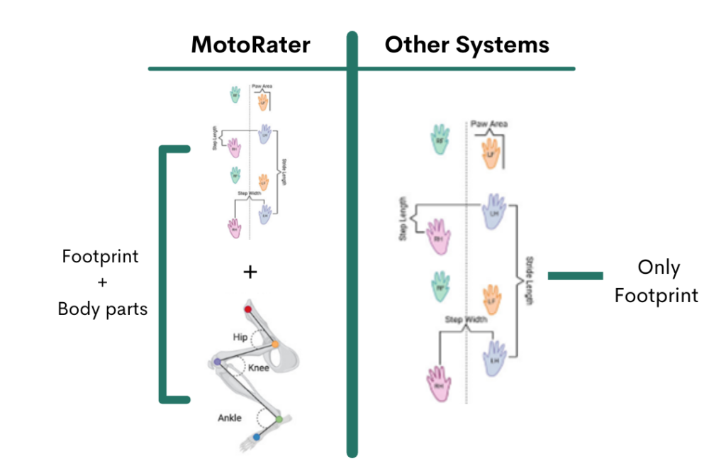 A high-speed camera observes the animal from three sides simultaneously and provides explicit readouts for targeted body parts, i.e., limbs, joints, tail, position head, etc. (virtually unlimited number of parameters) making this a comparative translational apparatus for disease study in humans.